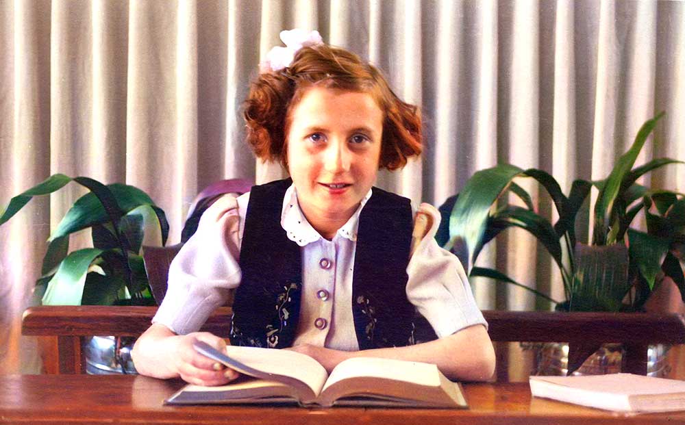 Maria Binnemans (Maria va Mil) omstreeks 1950 op een schoolbank.Maria (º1937-†2022), dochter van Emiel Binnemans (º1907-†1972) en Maria Hendrickx (º1901-†1984), huwde in 1961 met Eduard Aerts.De foto werd ingekleurd.